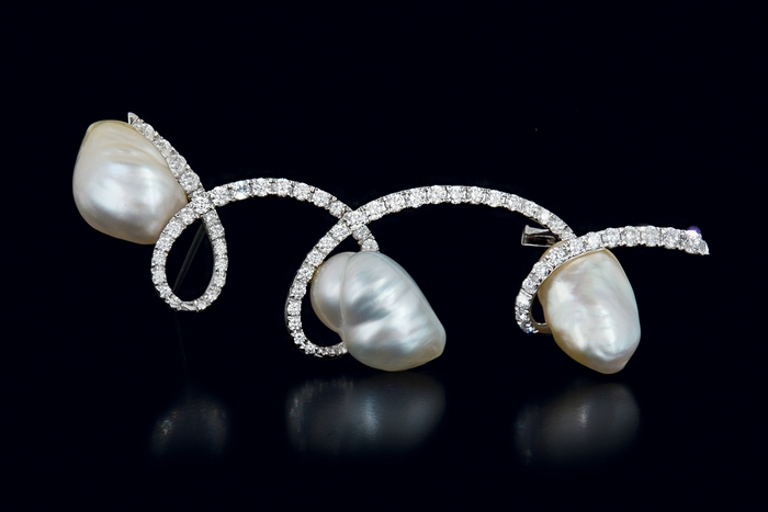 SPILLA DI UTOPIA. In oro bianco 18 kt montatura a volute realizzate a ricciolo interamente percorse da diamanti taglio brillante per tot. cts. 2,10 ca. impreziosita da perle coltivate Keshi disposte a fantasia, chiusura ad ago semplice, gioiello numerato: GSD101.