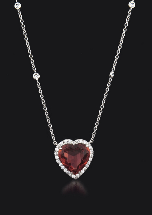 CIONDOLO. In oro bianco 18 kt centrato da tormalina rosa taglio cuore di cts. 9,00 ca. entro profilo in diamanti taglio brillante per tot. cts. 1,00 ca. disposti anche sulla catenina in oro bianco 18 kt.