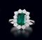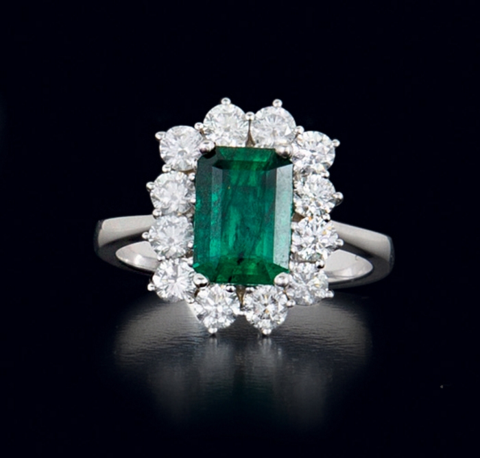 ANELLO. In oro bianco 18 kt sommità a fiore con smeraldo taglio rettangolare a contorno ottagonale di cts. 2,30 ca. entro contorno in diamanti taglio brillante per tot. cts. 1,50 ca.