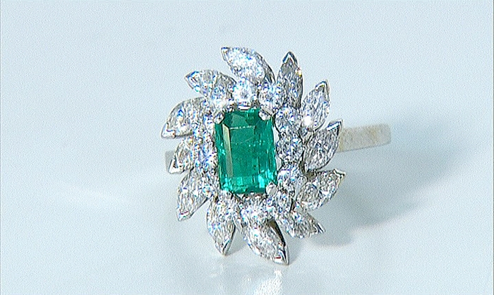 ANELLO. In oro bianco 18 kt con smeraldo taglio rettangolare a contorno ottagonale di cts. 1,00 ca. entro doppia cornice in diamanti taglio brillante e navette per tot. cts. 1,00 ca.