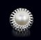 ANELLO. In oro bianco 18 kt internamente foderato, sommità bombata realizzata in fili d'oro liscio con al centro perla coltivata South Sea di mm 15 ca. entro cornice in diamanti taglio brillante per tot. cts. 0,40 ca.