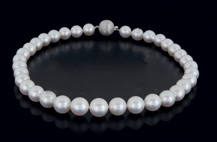 COLLANA. Ad un filo di perle coltivate South Sea disposte in gradazione dal centro di mm 14/12 ca. con chiusura a sfera satinata in oro bianco 14 kt decorata da piccoli diamanti taglio brillante.
