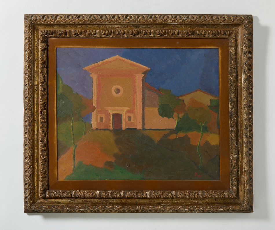 POGGI D'ANGELO MARINA (1910 - 2001) CHIESETTA DI CAMPAGNA . Olio su tela. Cm 60,00 x 50,00. firma. Cornice presente
