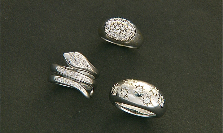 LOTTO DI TRE ANELLI. In oro bianco 18 kt, uno con castoni a stella e moissaniti taglio brillante, uno a serpente con diamanti taglio brillante per tot. cts. 0,20 ca. ed uno ovale con diamanti taglio huit-huit per tot. cts. 0,30 ca.