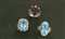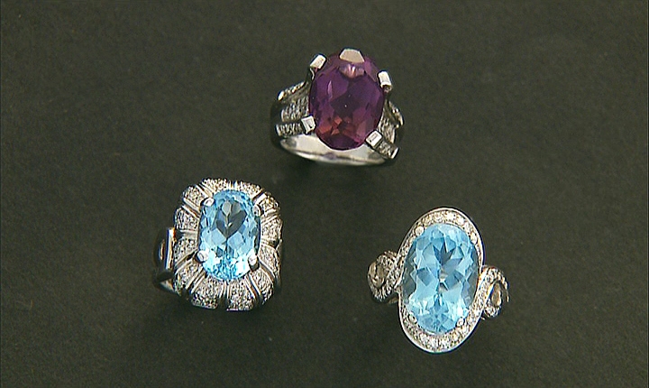 LOTTO DI TRE ANELLI. In oro bianco 18 kt di diversa forma e raffigurazione, due con topazi azzurri taglio ovale ed uno con ametista taglio ovale entro decori in diamanti taglio huit-huit per tot. cts. 1,90 ca.