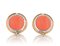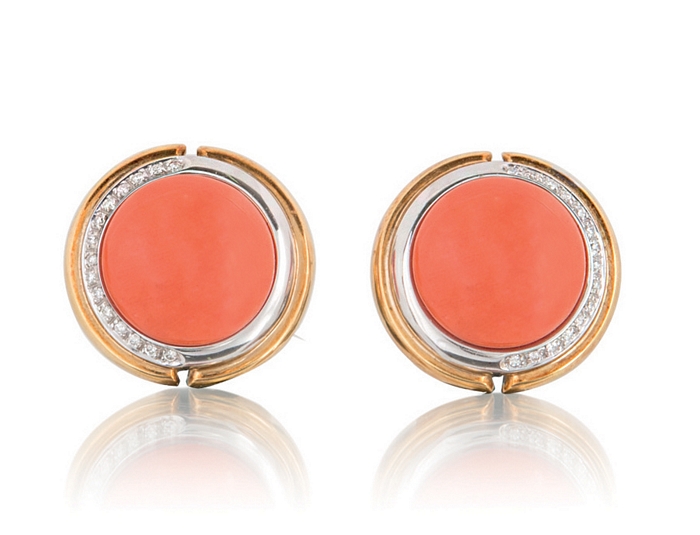 COPPIA DI ORECCHINI. In oro giallo e bianco 18 kt perno e clip centrati da inserti in corallo taglio rotondo cabochon entro doppia cornice con motivo in diamanti taglio brillante per tot. cts. 0,15 ca.