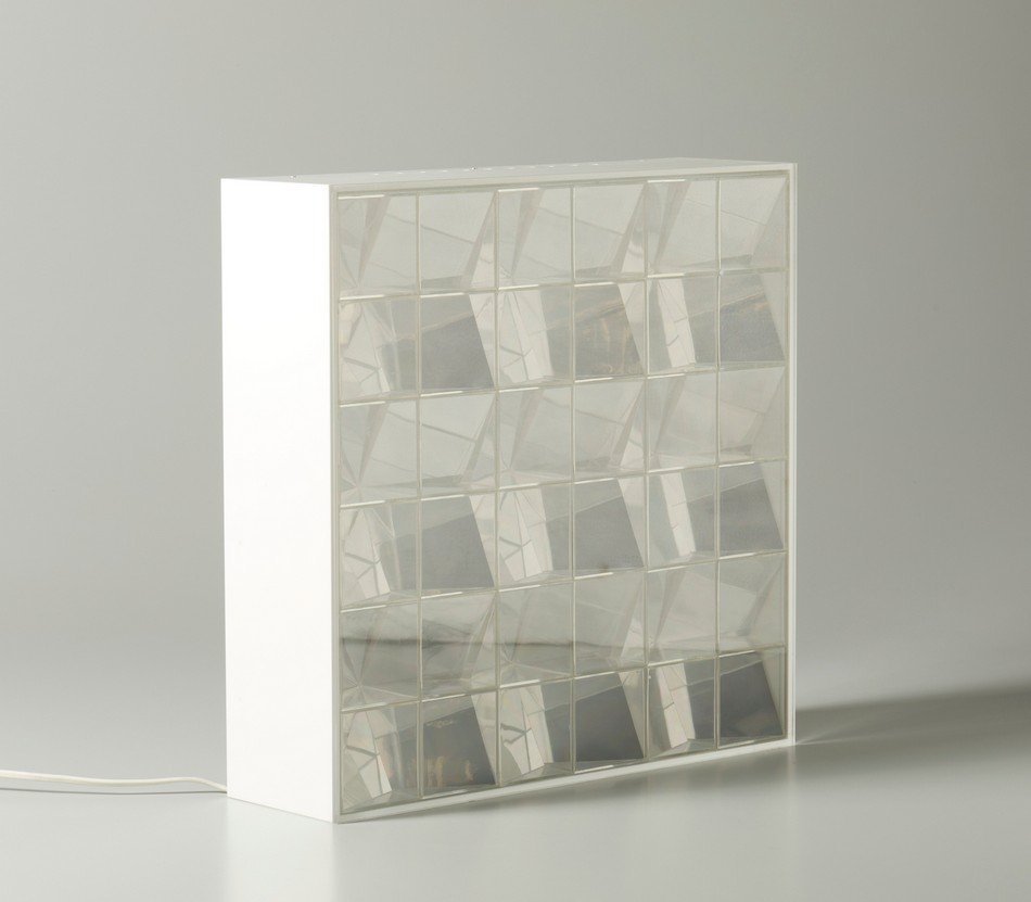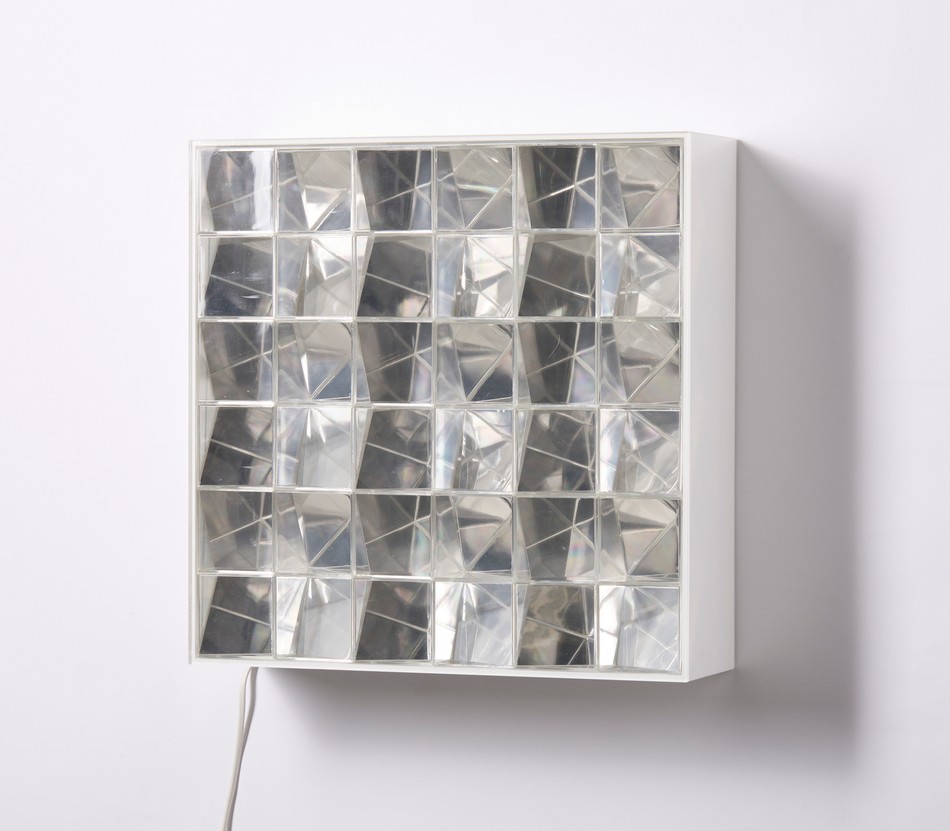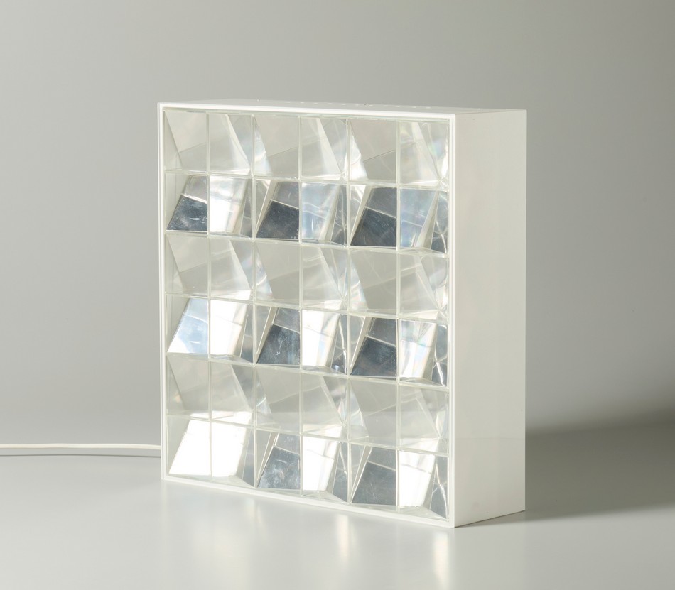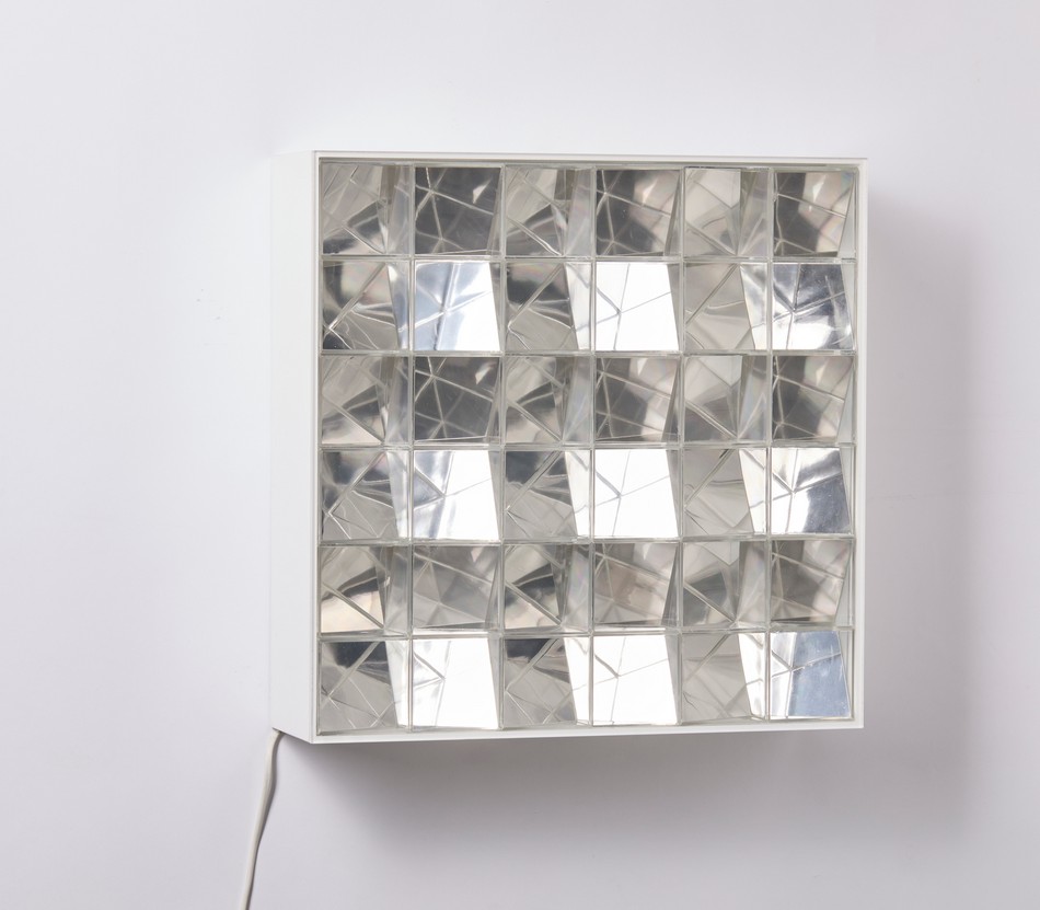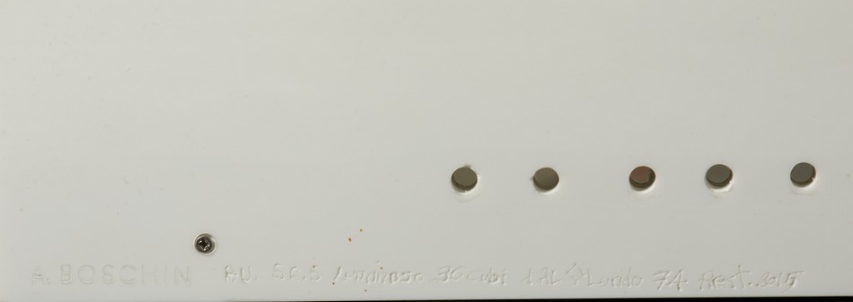BOSCHIN ALDO (n. 1942) P.U. 56.5 LUMINOSO 36 CUBI. 1974. 36 cubi in una scatola di plexiglass, foglio di alluminio e luci al neon. Cm 42,00 x 42,00 x 12,00. firma, data, titolo incisi