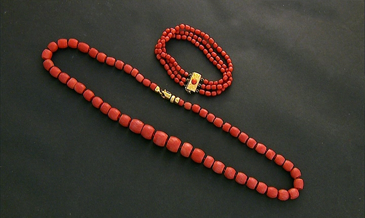 LOTTO DI DUE GIOIELLI. Composta da collana ad un filo di barilotti sfaccettati in corallo disposti in gradazione dal centro e da bracciale a tre fili di inserti in corallo, chiusure in oro giallo 18 kt.