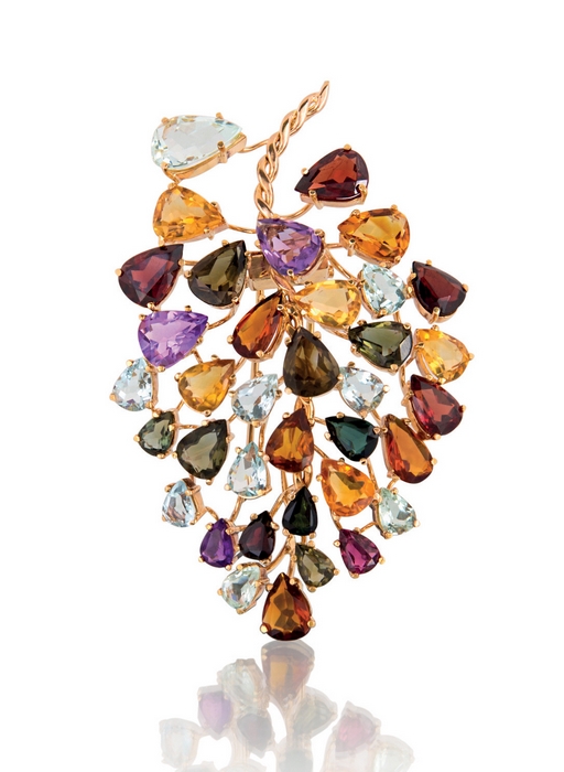 SPILLA. In oro giallo 18 kt a grande ramage con gemme preziose multicolor taglio goccia (prob. ametiste, acquamarine, granati, olivine e quarzi).