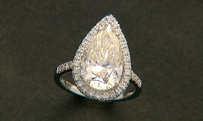 ANELLO. In oro bianco 18 kt centrato da diamante taglio goccia di cts. 5,156 (colore M purezza VS2) entro cornice sagomata in diamanti taglio brillante per tot. cts. 0,90 ca. disposti anche sui lati, accompagnato da verifica gemmologica n. 20115-0218, Dott. Carlo Cumo, Valenza.