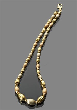 COLLANA Collana in oro giallo lucido e oro bianco e rosa satinato Peso gr 42,10 nackelace with shiny yellow gold brushed white gold and brushed rose gold beads Weight 42.10 gr