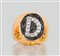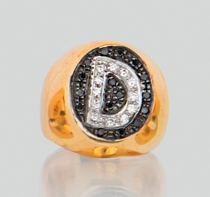 ANELLO. In oro bianco e rosa 18 kt sommità ovale con motivi in diamanti neri taglio brillante per tot. cts. 0,20 ca. e diamanti incolore taglio brillante per tot. cts. 0,10 ca. a decorazione della lettera "D".