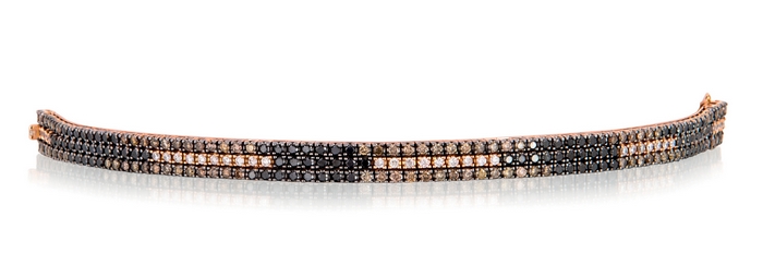 BRACCIALE. In oro rosè 18 kt a tre fili tennis interamente percorsi da diamanti incolore, neri e brown per tot. cts. 6,40 ca. entro castoni a quattro griffes.