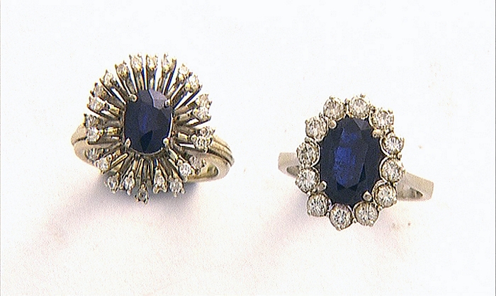 LOTTO DI DUE ANELLI. In oro bianco 18 kt centrati da zaffiri taglio ovale per tot. cts. 3,20 ca. entro decori in diamanti taglio brillante e huit-huit per tot. cts. 1,10 ca.
