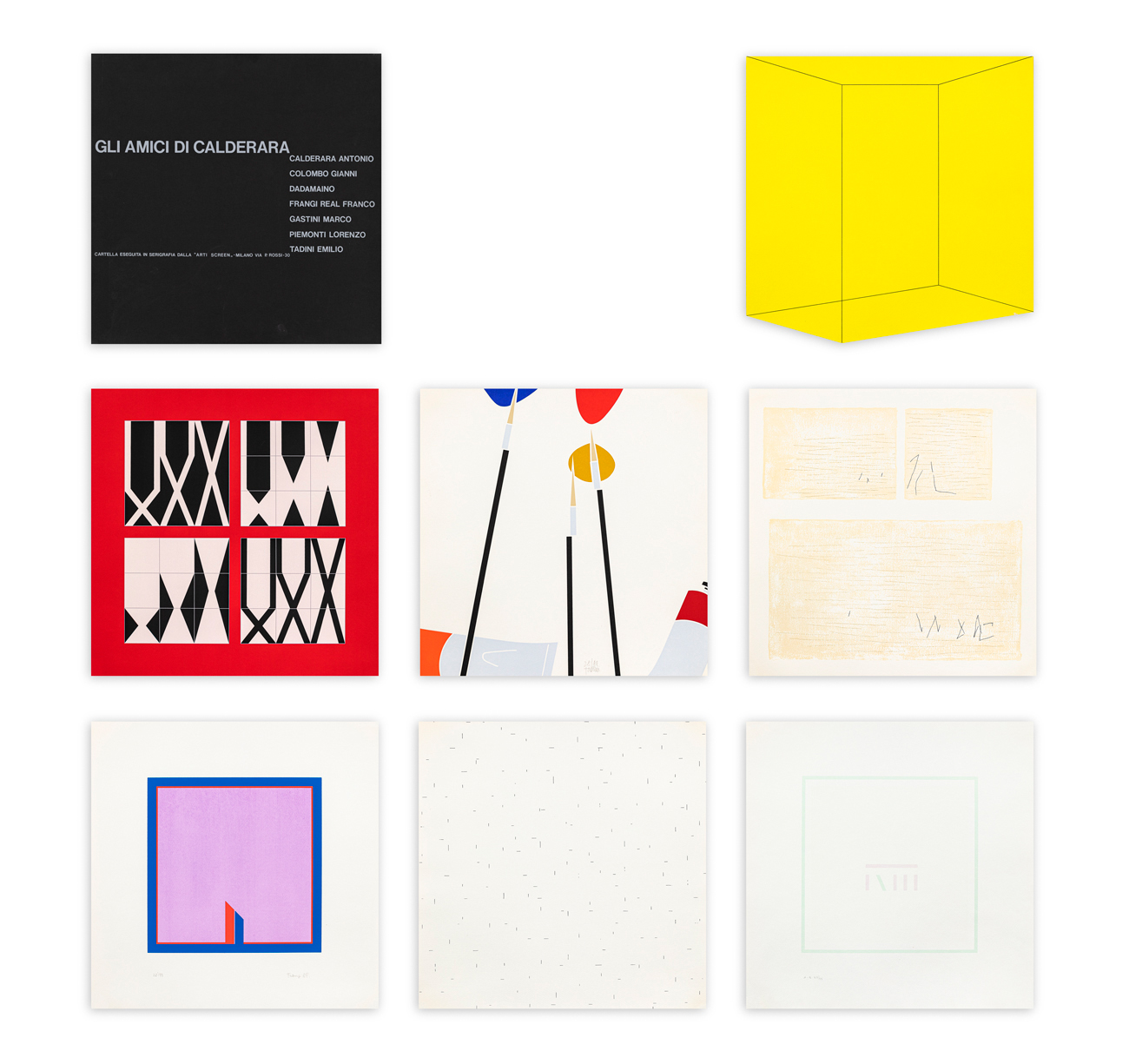 Cartella contenente 1 testo di Emilio Tadini e 7 serigrafie di Antonio Calderara, Gianni Colombo, Reale Franco Frangi, Marco Gastini, Lorenzo Piemonti ed Emilio Tadini ciascuna recante firma e numerazione (Esemplari 31/99) a matita
