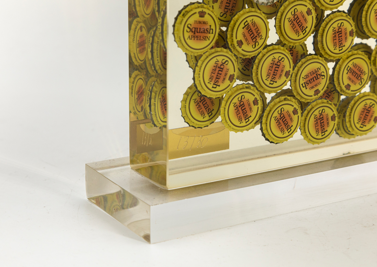 Inclusione di tappi Tuborg in resina