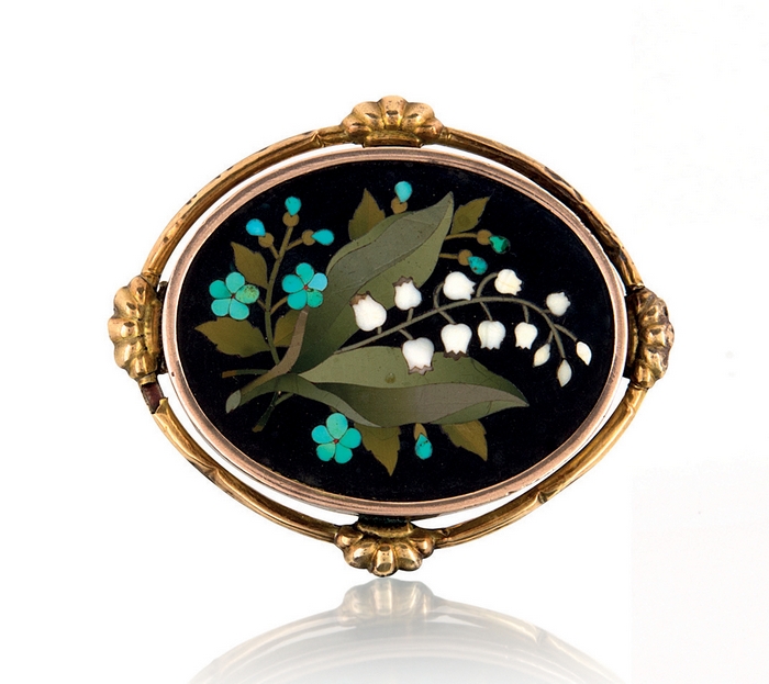 SPILLA INIZIO XX SECOLO. In oro giallo bassa caratura con al centro mosaico fiorentino di gusto floreale entro cornice in oro scatolato (visibili ammaccature).