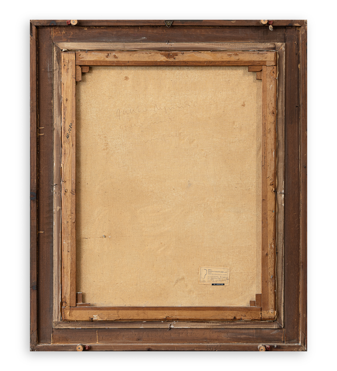 Timbro ed etichetta della Galleria Nuovo Sagittario (MI), con caratteristiche tecniche dell'opera, al retro