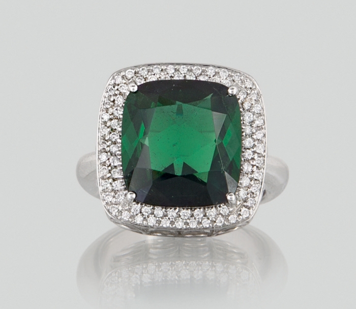 ANELLO. In oro bianco 18 kt montatura traforata ai lati con al centro tormalina verde taglio cuscino di cts. 8,80 ca. entro cornice in diamanti taglio brillante a pavè per tot. cts. 0,40 ca.