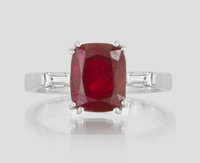 ANELLO. In oro bianco 18 kt centrato da rubino taglio cuscino Burma (Myanmar) di cts. 3,46 (nessuna presenza di trattamento termico) con ai lati due diamanti taglio baguette per tot. cts. 0,10 ca., accompagnato da certificato n. 030497T del 05/04/2012, GRS, Lucerna.