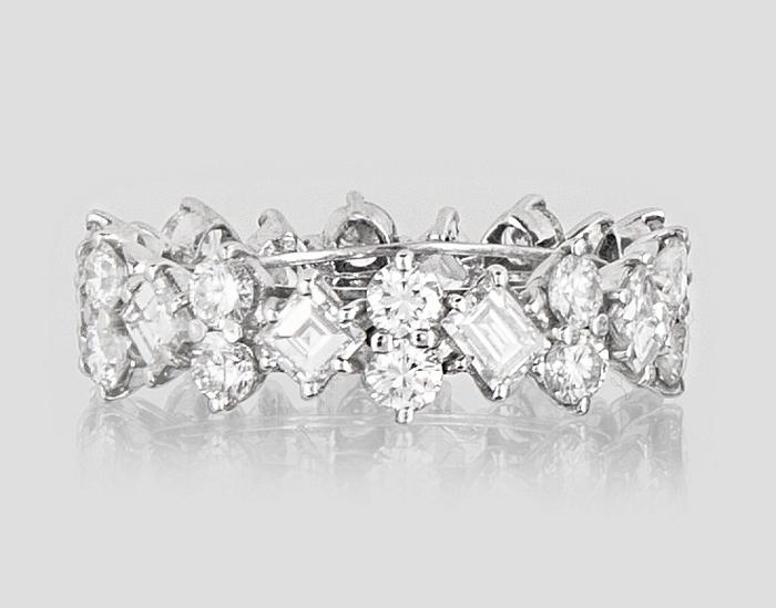 ANELLO ETERNEL. In platino montatura rigida interamente percorsa da diamanti taglio carrè, baguette e brillante per tot. cts. 3,40 ca. (prob. colore H purezza VS/VVS)