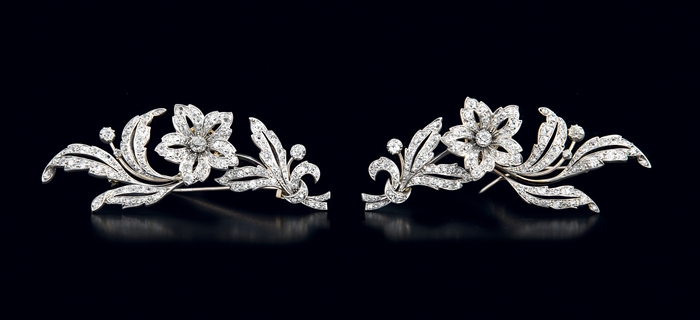 COPPIA DI SPILLE INIZIO XX SECOLO. In oro giallo 18 kt ed argento a grandi ramage con centrali a fiore su settori realizzati "en tremblant" con diamanti taglio vecchio per tot. cts. 6,40 ca. a decoro.