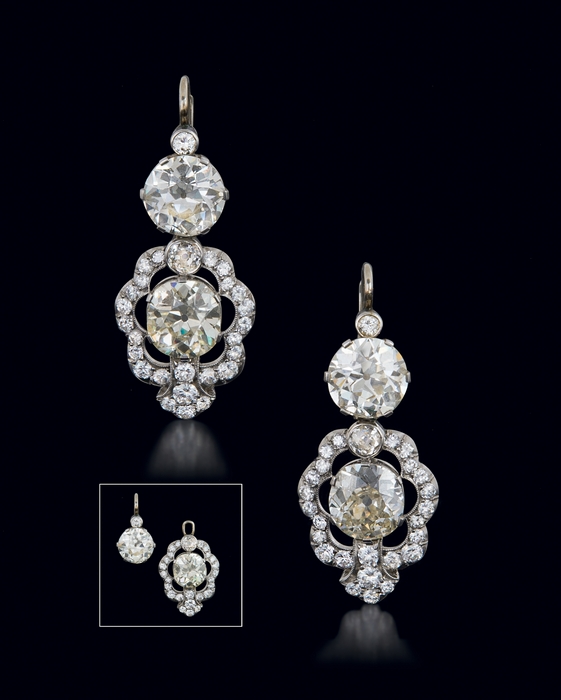 COPPIA DI ORECCHINI PENDENTI ANNI '30 CA. In oro bianco 18 kt a monachella e clip con quattro diamanti taglio vecchio di cts. 2,30 - 2,20 - 2,50 - 1,70 ca. (prob. purezza VS) entro cornici in diamanti taglio vecchio per tot. cts. 1,30 ca. con profili milligranati, visibili punzoni del fascio.