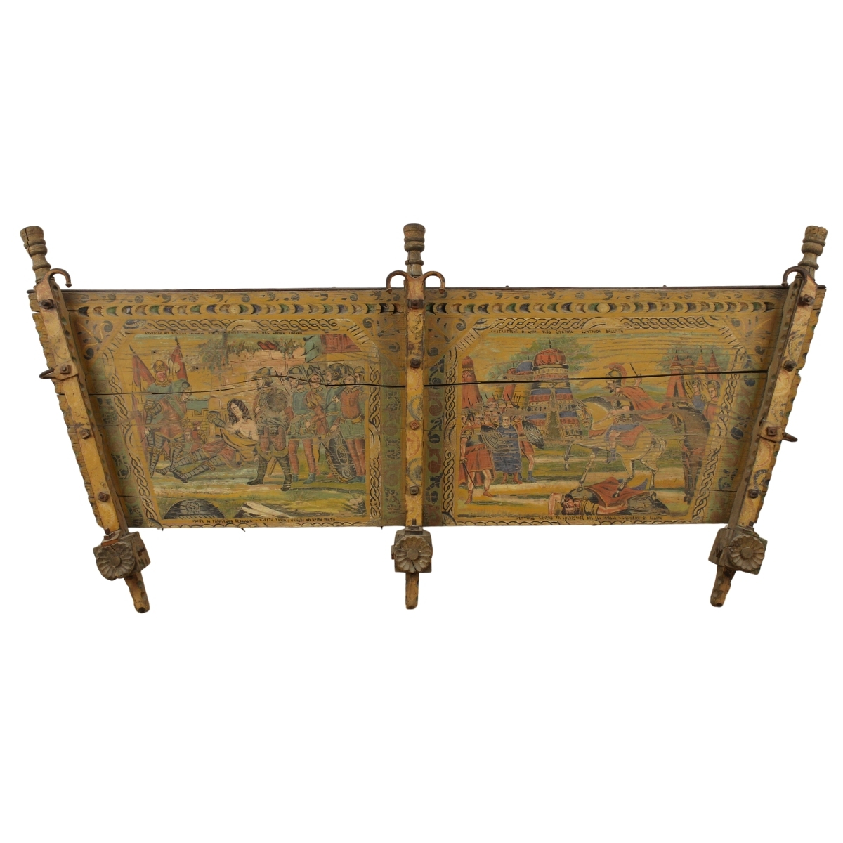 Sponda di carretto Legno dipinto con scene storiche. Realizzata e decorata da Tommaso Calvino e Alessandro Gaetano. Trapani. Cm 148x70
