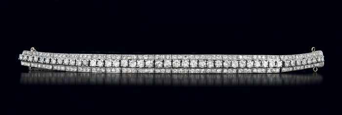 BRACCIALE. In platino con maglie incernierate percorse al centro da diamanti taglio brillante per tot. cts. 6,90 ca. entro doppia fila in diamanti taglio brillante per tot. cts. 4,40 ca.