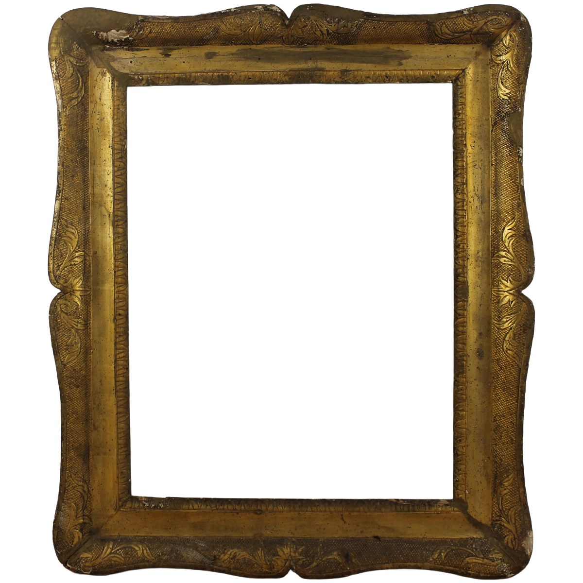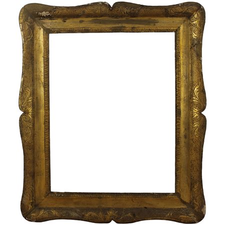 Cornice a guantiera Legno dorato e inciso (danni e restauri). Sicilia. Secolo XIX. Cm 65x51 (misure interne); cm 71x84 (misure e sterne)