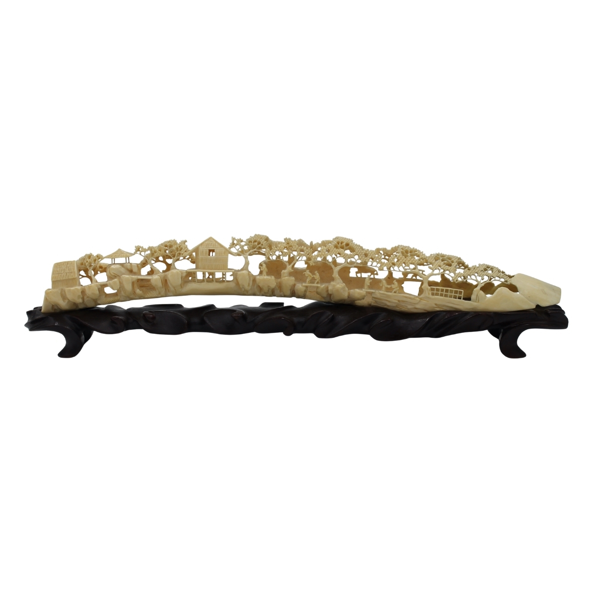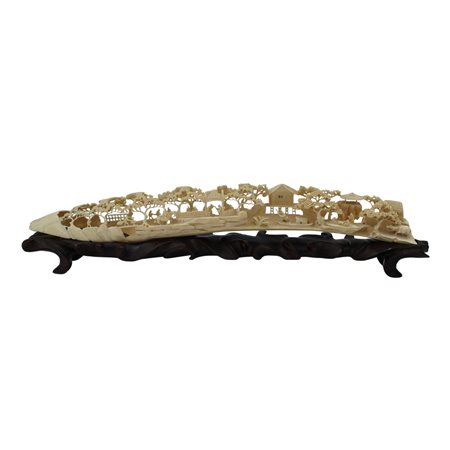 "Scena di vita quotidiana" Zanna di elefante magistralmente scolpita e cesellata. Cina. Fine secolo XIX. Lotto dotato di certificazione Cites che ne consente il commercio in tutto il territorio europeo. Cm 47x6,5