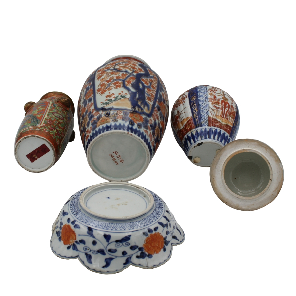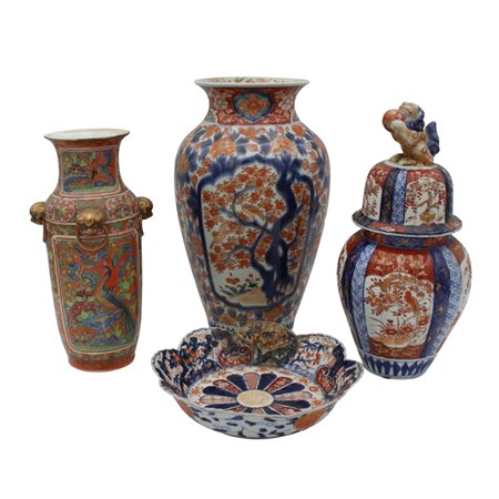 Due vasi, una potiche e un piatto Antica porcellana con decoro a motivi floreali e ornamentali policromi (danni e restauri). Imari. Secolo XX