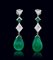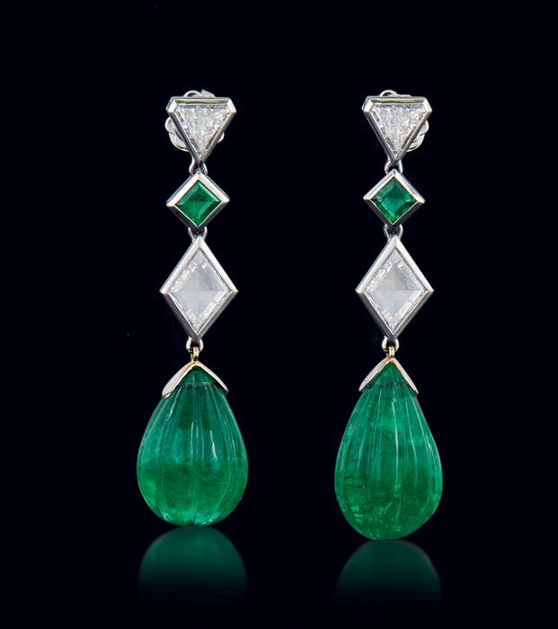 COPPIA DI ORECCHINI PENDENTI. In oro bianco 18 kt perno e farfalla con settori geometrici incernierati disposti in verticale decorati da diamanti taglio triangolo e rombo per tot. cts. 2,50 ca., smeraldi taglio rettangolare per tot. cts. 0,60 ca. e smeraldi taglio goccia cabochon incisi a motivi costolati per tot. cts. 30,00 ca. imperniati nella parte terminale.