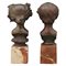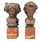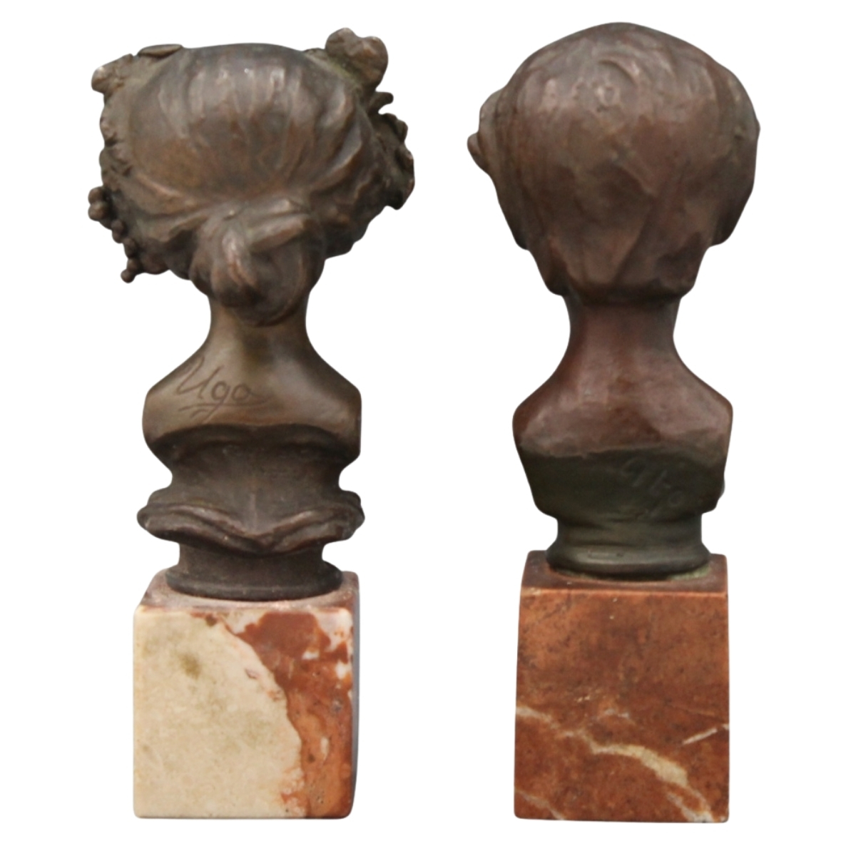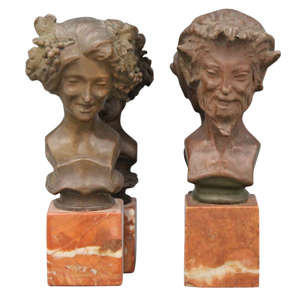 Antonio Ugo (1870/1950) "Fauno e Stagione" Due piccole sculture in bronzo patinato su base in marmo rosso venato. Cm h 14