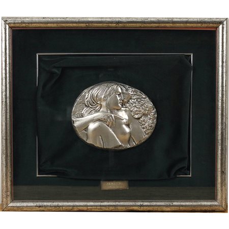 Emilio Greco (1913/1995) "Primavera" Bassorilievo in lamina di argento 999/1000. Serie Zecca dello Stato. Certificato di autenticità della Società Italiana per le Edizioni d'Arte. Cm 19x14,5