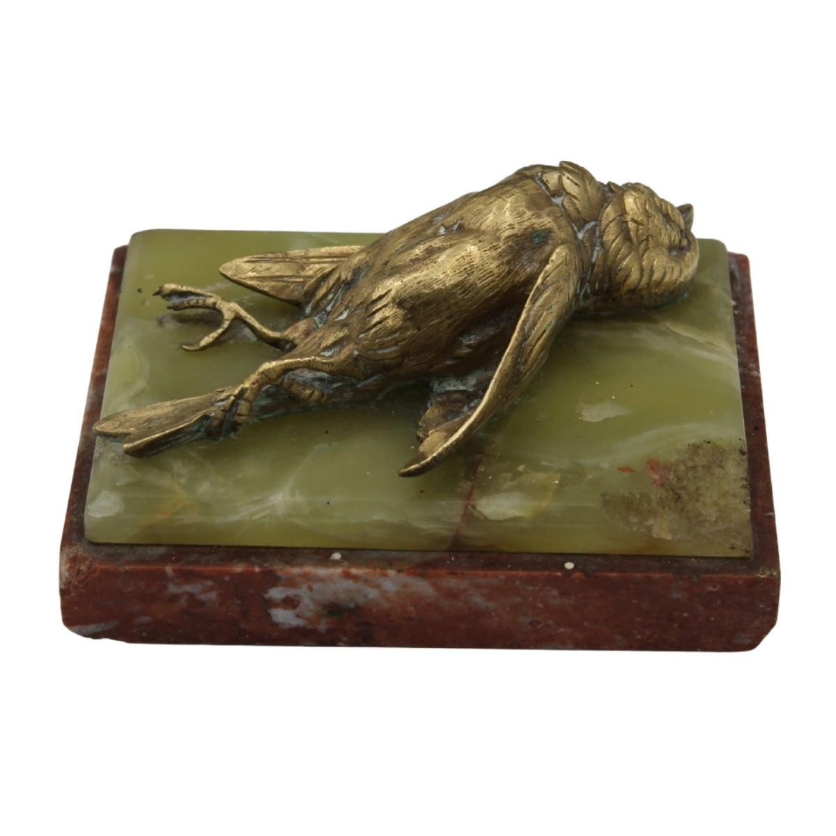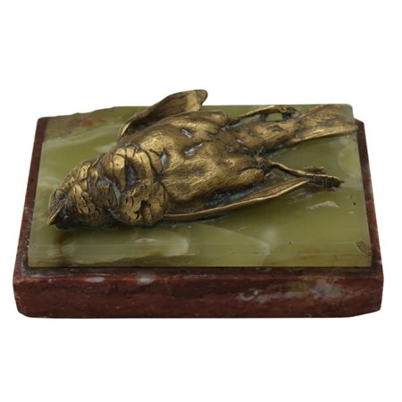 "Uccellino" Scultura in bronzo su base in onice e marmo. Cm 13 (uccellino); cm 13x10 (base)
