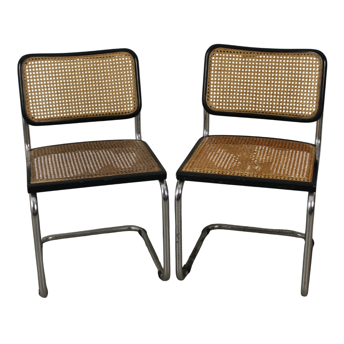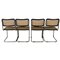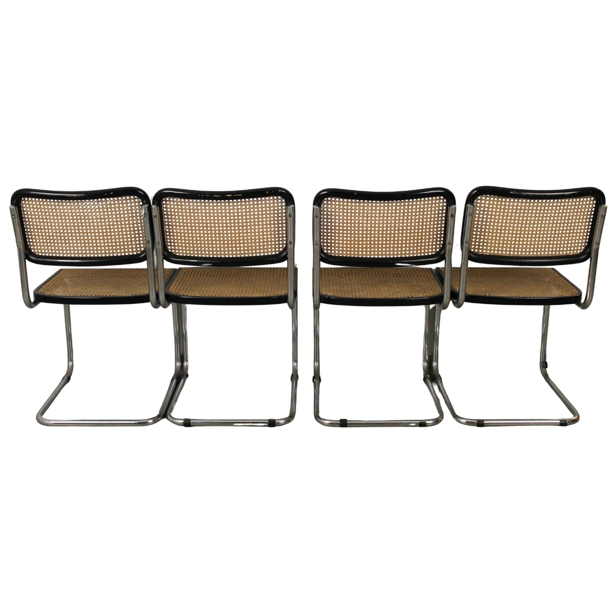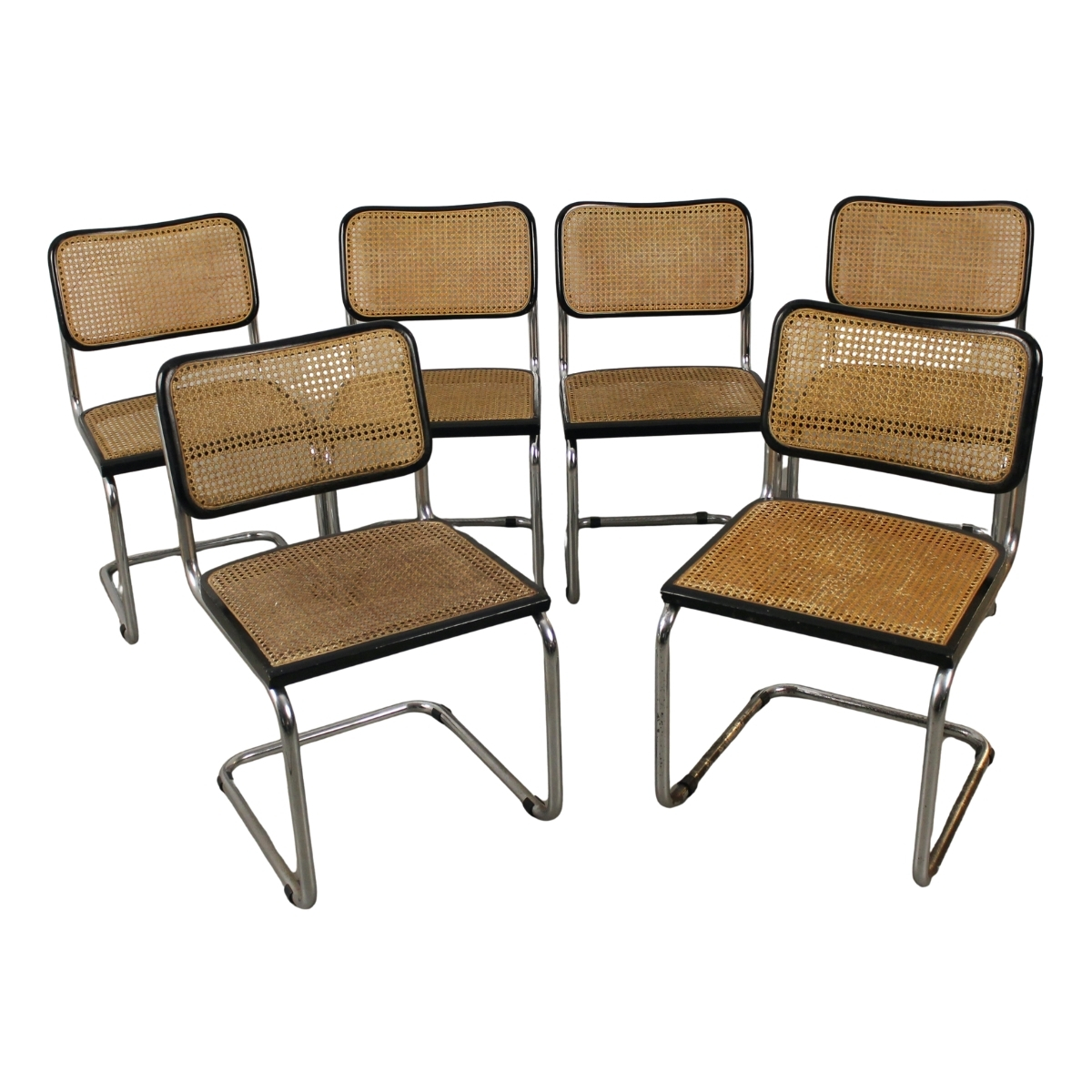 Marcel Breuer (1902/1981) "Sei sedie Cesca" Struttura in acciaio cromato, spalliera e seduta in paglia di Vienna con bordo di faggio massello (segni di usura). Quattro sedie delle sei misurano cm 47,5x50x83,5; due misurano 46,5x52x79