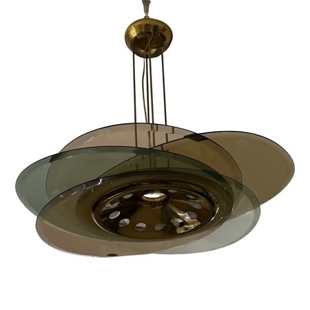 Max Ingrand (1908/1969) "Lampada a sospensione Mod. 1452" Diffusori in vetro molato colorato, struttura in ottone (danni alla coppa e impianto elettrico da revisionare). Produzione Fontana Arte. 1950 circa. Cm 80x80x70