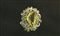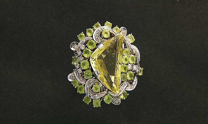 ANELLO. In oro bianco 18 kt sommità bombata a cestello con al centro grande quarzo citrino taglio fantasia entro decori in gemme verdi taglio rotondo (prob. quarzi) e diamanti taglio brillante per tot. cts. 0,50 ca. su settori a volute milligranate.