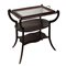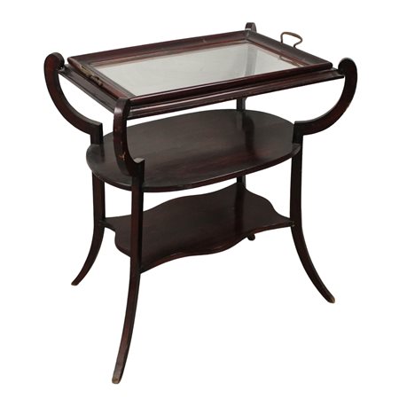 Tavolino Noce con piedi ricurvi e piano in vetro con vassoio estraibile. Epoca Liberty. Cm 69x46x72
