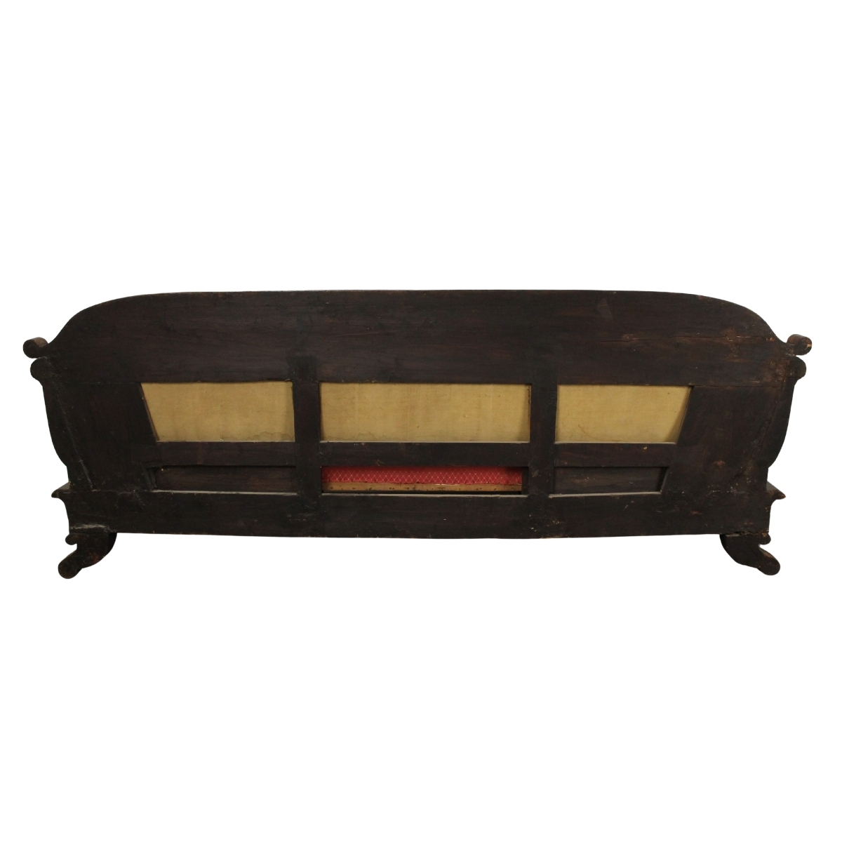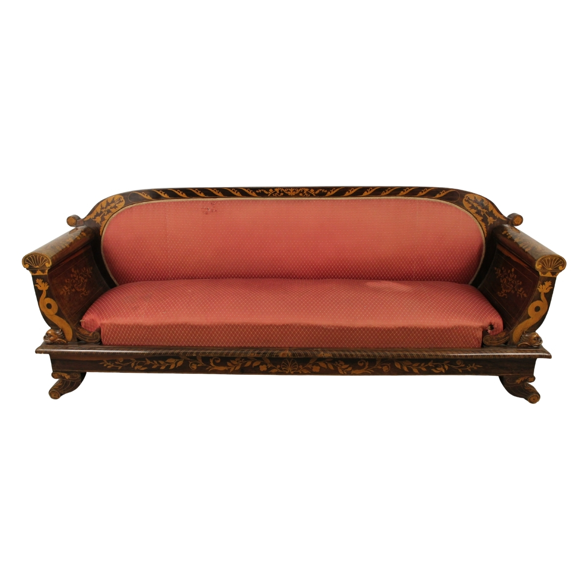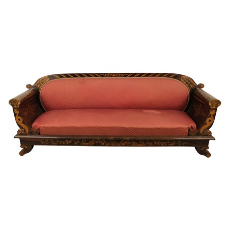 Elegante divano Palissandro riccamente intarsiato a motivi floreali e ornamentali con elementi scolpiti a teste di tritoni. Ebanisteria siciliana. Epoca Luigi Filippo. Cm 230x64x88