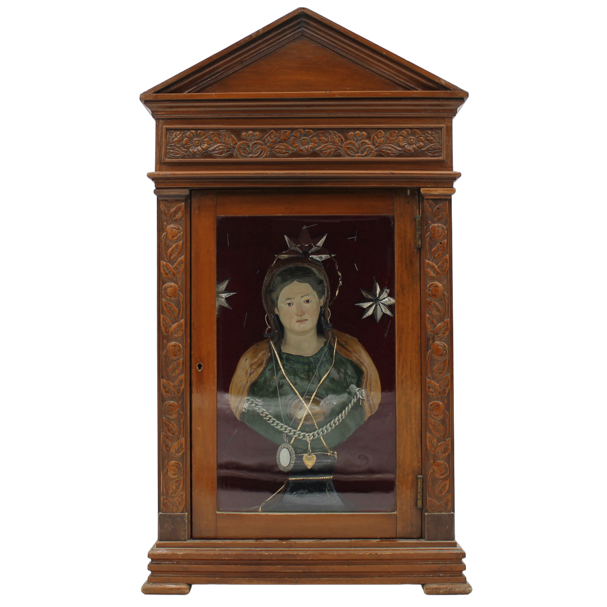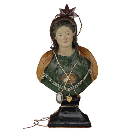 "Figura votiva" Mezzobusto in terracotta policroma inserito in teca in noce scolpito. Sicilia. Secolo XIX. Cm h 31 (figura); cm 33x22x58 (teca)