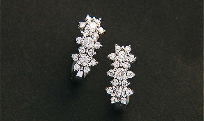 COPPIA DI ORECCHINI. In oro bianco 18 kt perno e clip, settori verticali leggermente arcuati a tre fiori in diamanti taglio brillante per tot. cts. 1,50 ca.