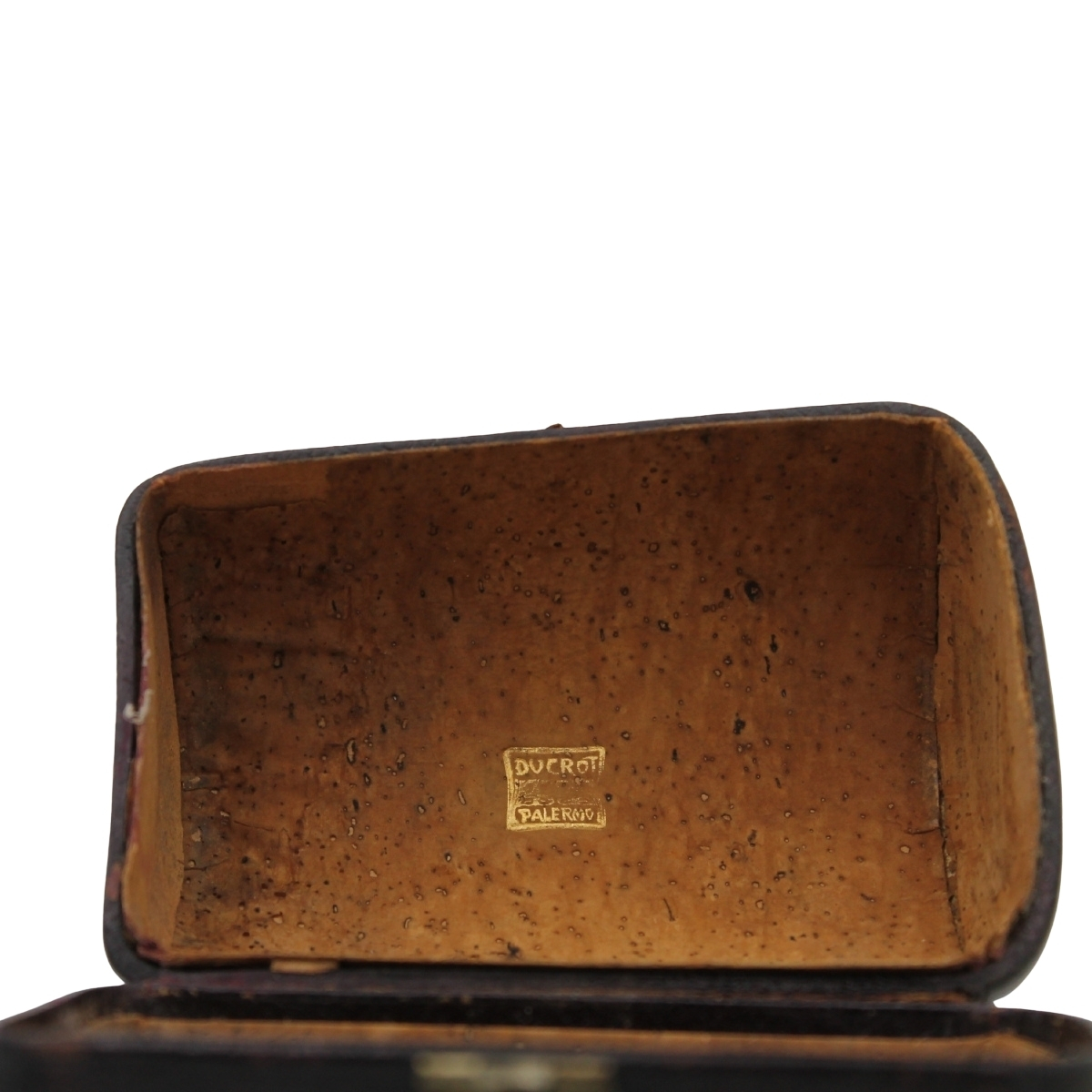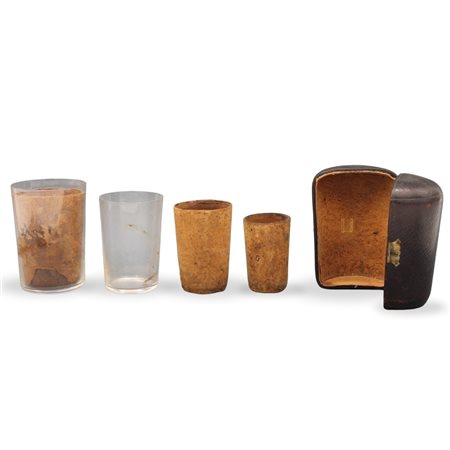 Set di bicchieri da viaggio Vetro e sughero in custodia in cuoio (danni alla fibbia dell'astuccio). Marcato Ducrot. Cm h 10 (astuccio)