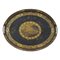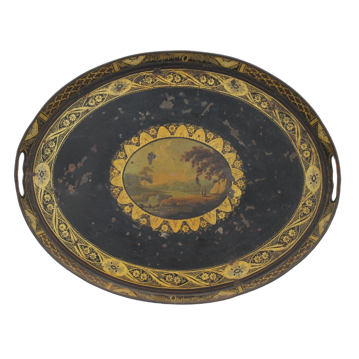 Vassoio Metallo decorato con paesaggio e figure a motivi ornametali e floreali dorati (mancanze). Francia secolo XIX. Cm 46x36