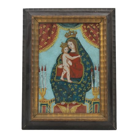 Scuiola siciliana della metà del secolo XIX "Madonna incoronata con bambino" Dipinto ad olio su vetro in cornice in legno. Cm 32x22