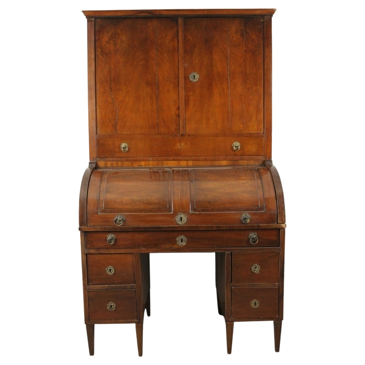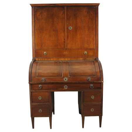 Mobile a rullo Mogano con cassetti nella parteinferiore, piccolo scrittoio a rullo e sportelli nella parte superiore (difetti e mancanze). Maniglie e borchie in rame e bronzo dorato. Sicilia. Metà del secolo XIX. Cm 118x70x208