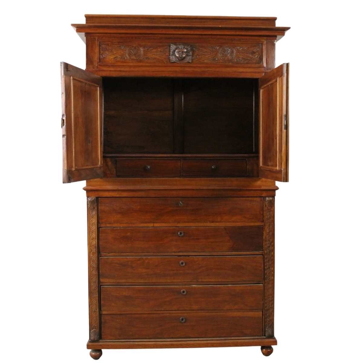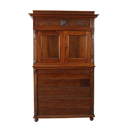 Chiffonier Noce con figure femminili scolpite sui laterali e mascherone nella parte centrale. Cinque cassetti nella parte inferiore. Ebanisteria siciliana. Fine secolo XIX. Cm 129x53x208