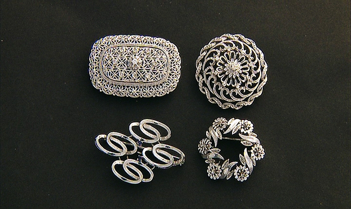 SPILLA LOTTO DI QUATTRO SPILLE ANNI '60/'70 CA. In oro bianco 18 kt, tre di...