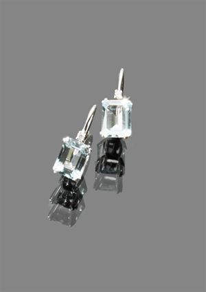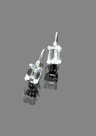 COPPIA DI ORECCHINI Coppia orecchini in oro bianco con acque marine di taglio carré con due piccoli diamanti taglio 8/8 Peso gr 5,40 white gold earrings with emerald cut acqua marine and small 8§/8 cut diamond Weight 5.40 gr